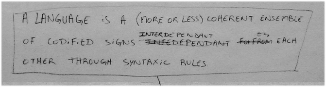 A language is a (more or less) coherent ensemble of codified signs interdependent on each other through syntactic rules.